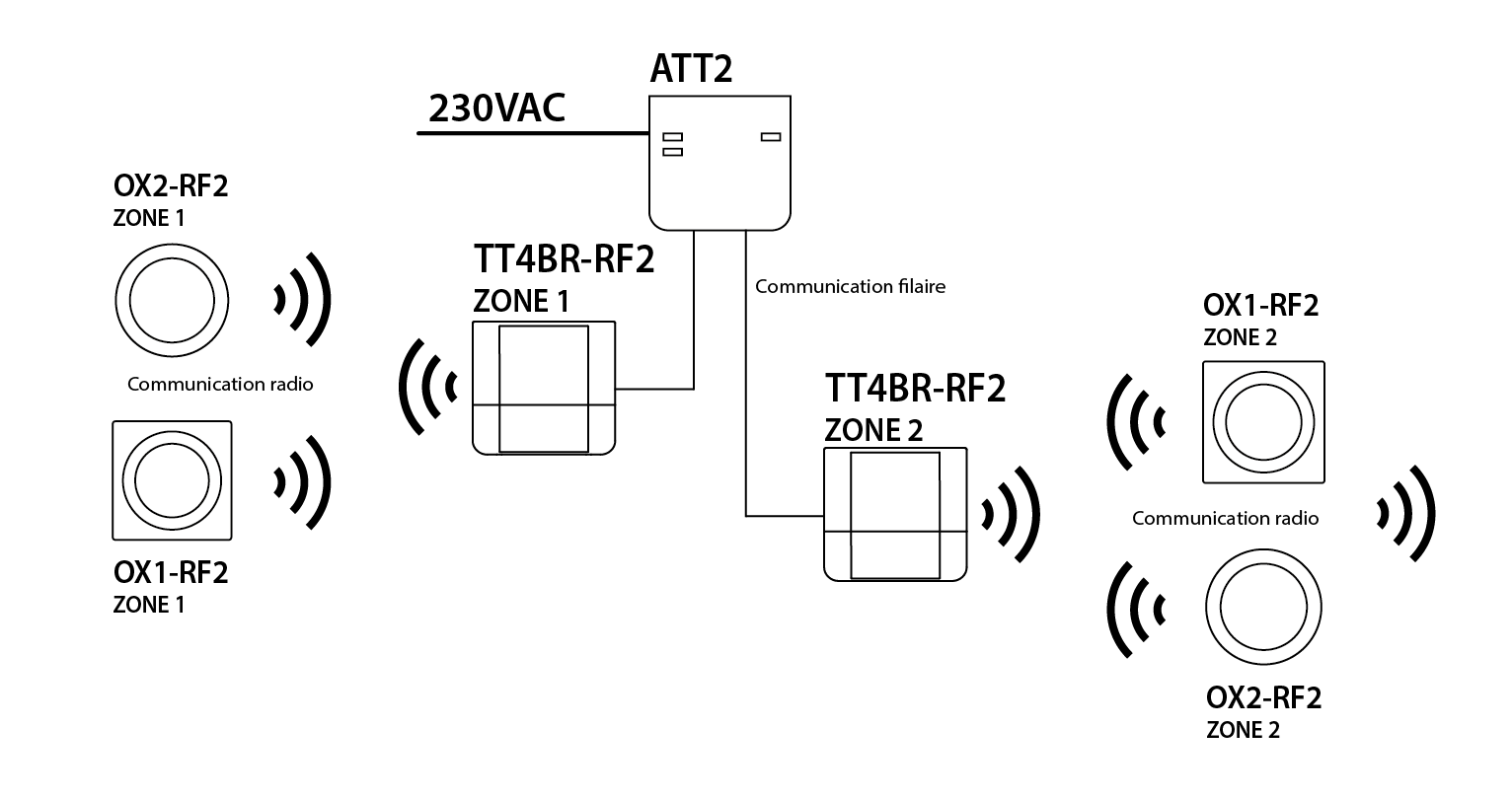 Portée des détecteurs extensible par transpondeurs (10 transpondeurs maximum par zone)